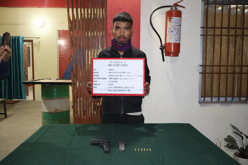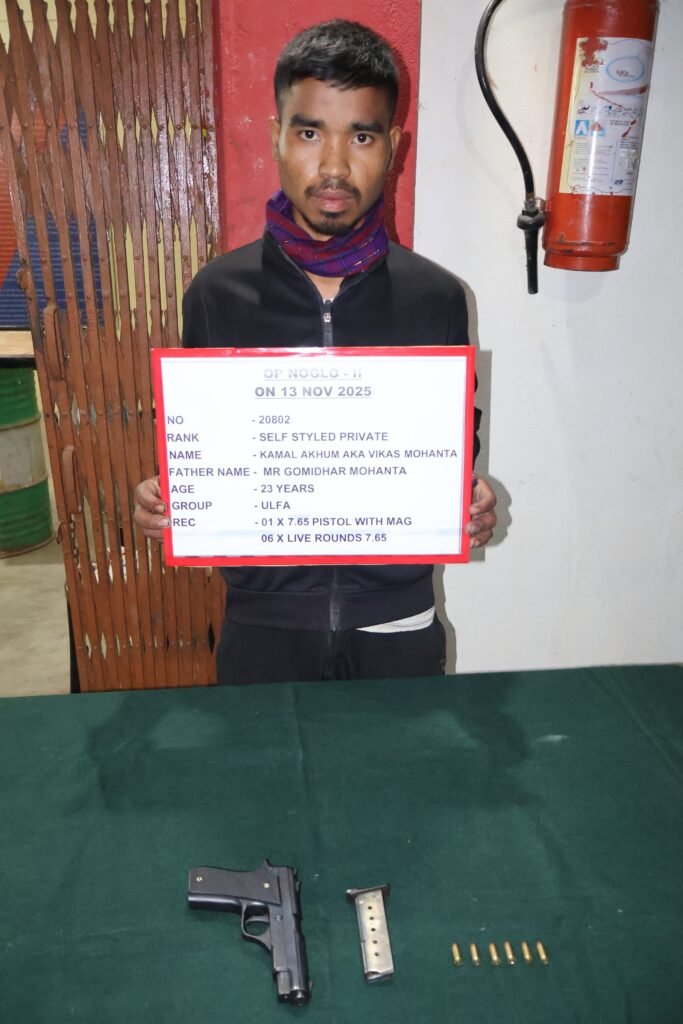 Assam Rifles, in close coordination with Arunachal Pradesh Police and Assam Police, facilitated the voluntary surrender of self-styled Private Kamal Akhun alias Vikas Mohanta, aged 23, an active member of the banned outfit. The operation was conducted in Noglo village following actionable intelligence.